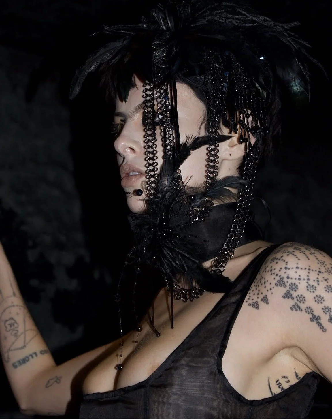 these headpieces using feathers, beads, metal chains, and dental floss.